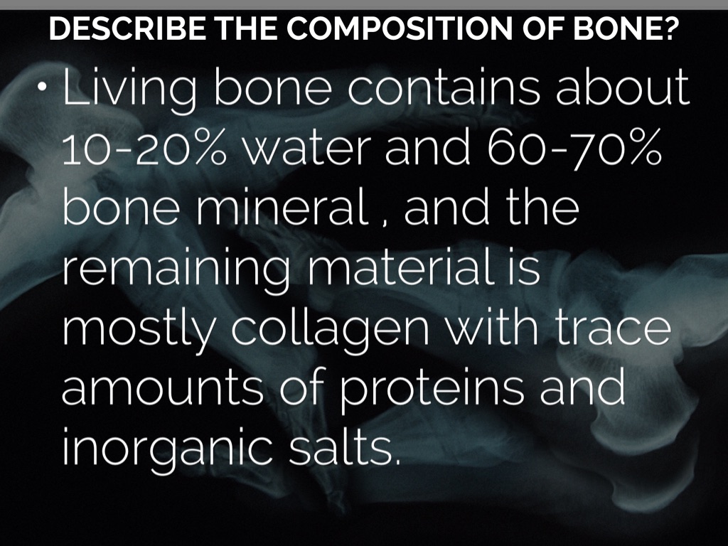 Living bone contains about 10-20% water and 60-70% bone mineral , and the remaining material is mostly collagen with trace amounts of proteins and inorganic salts.