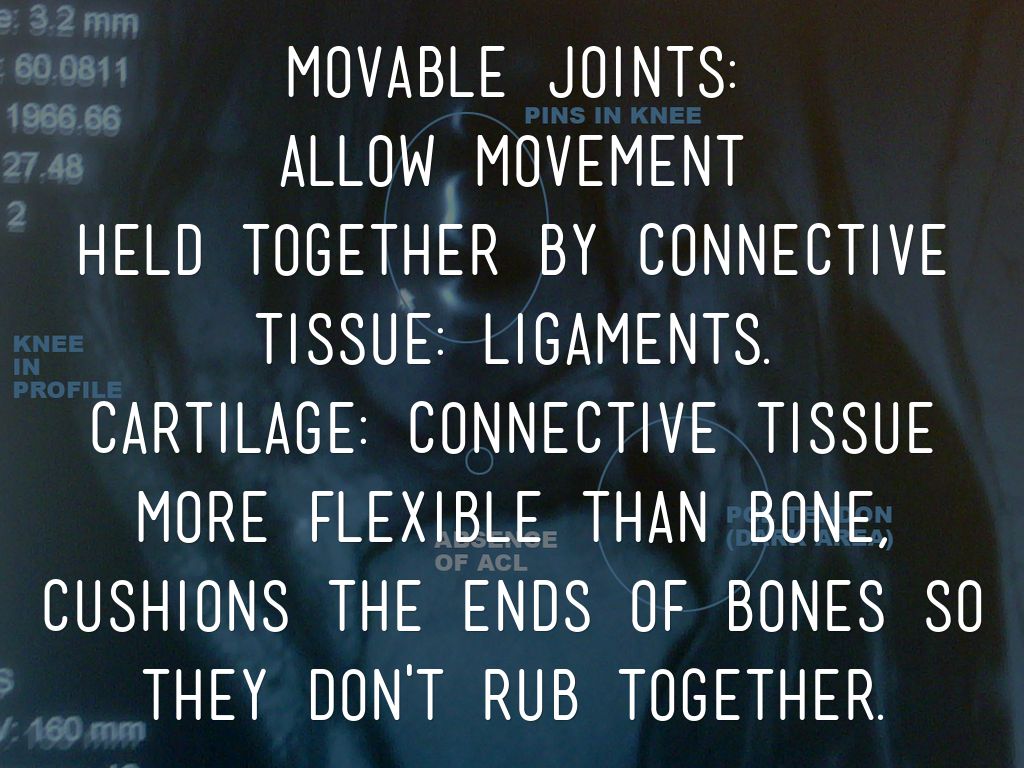 Cartilage: connective tissue more flexible than bone, cushions the ends of bones so they don't rub together.