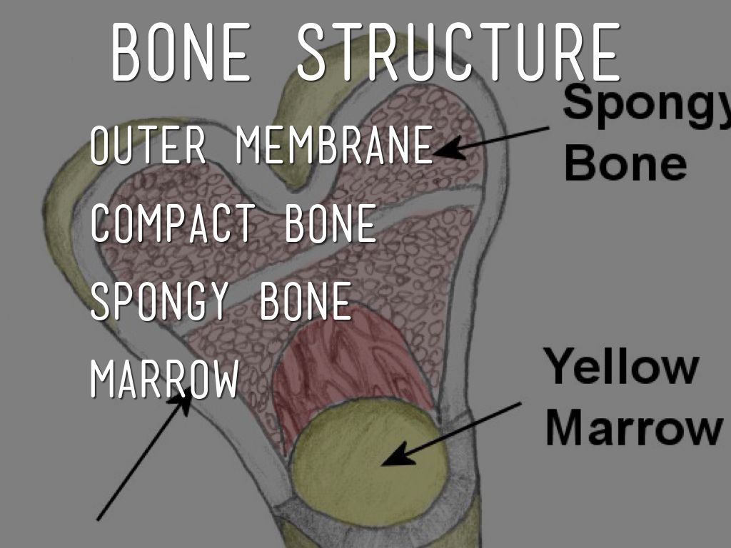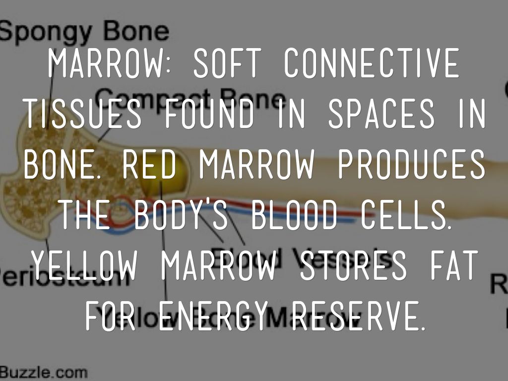 Marrow: soft connective tissues found in spaces in bone. Red marrow produces the body's blood cells. Yellow marrow stores fat for energy reserve.