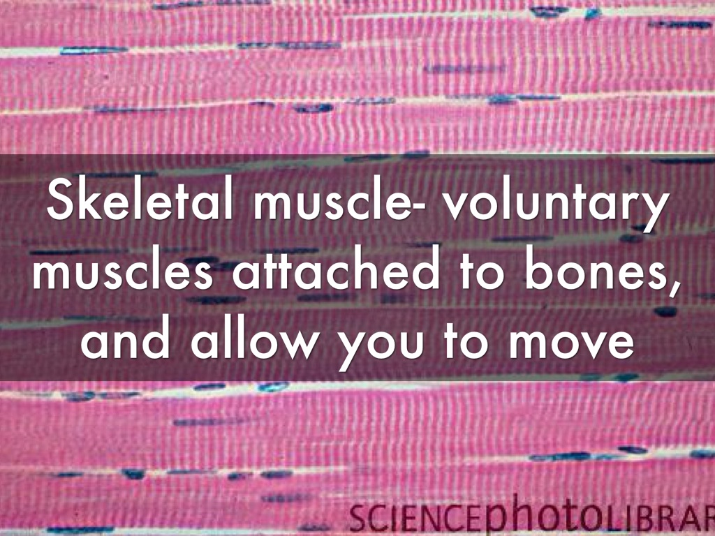 Skeletal muscle- voluntary muscles attached to bones, and allow you to move