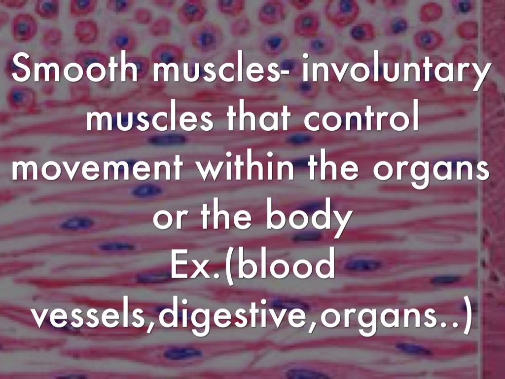 Smooth muscles- involuntary muscles that control movement within the organs or the body