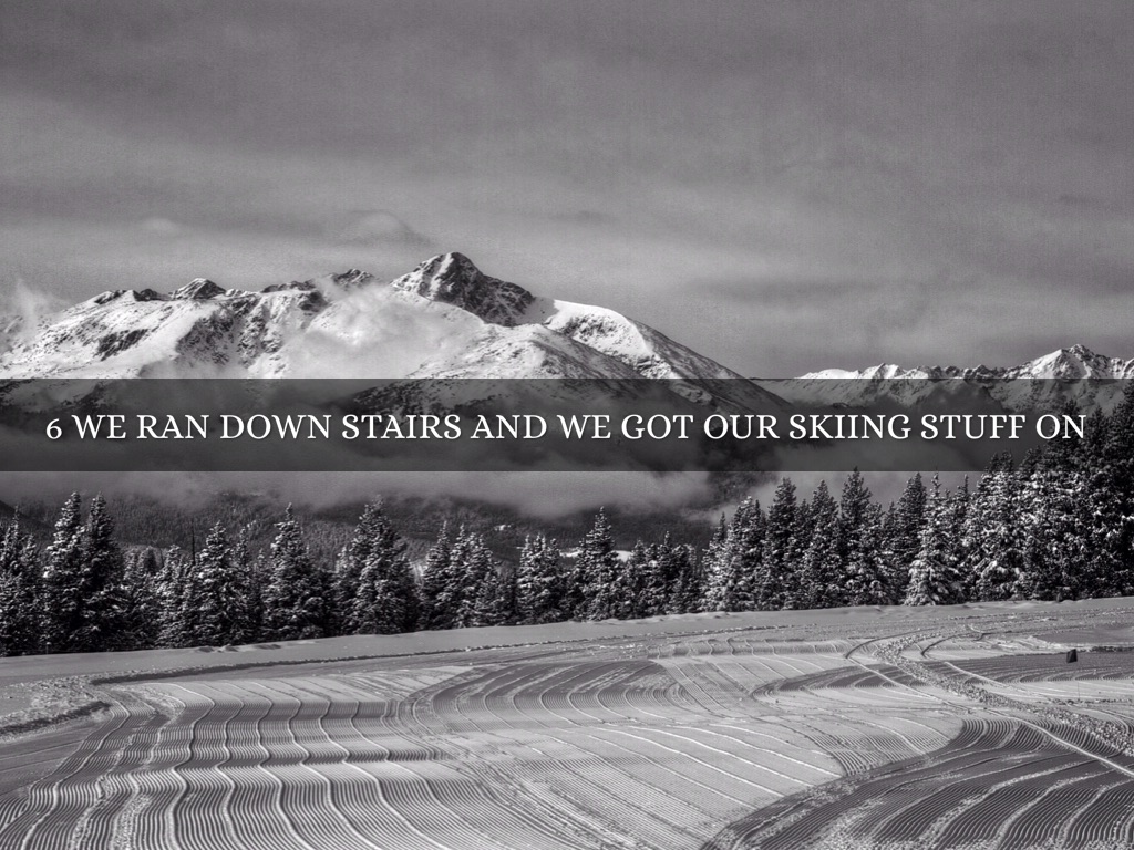 6 WE RAN DOWN STAIRS AND WE GOT OUR SKIING STUFF ON