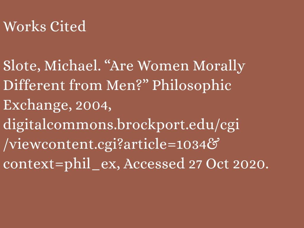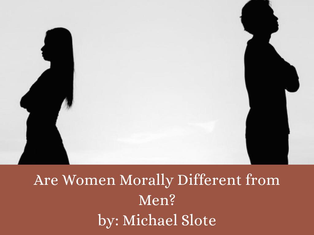 Men and women do have different approaches to dealing with moral issues though. In the article, “Are women morally different from men?”, Slote states “If women think about morality differently from men, one may then wonder whether men and women are governed by different moralities, [...] (Slote 32,33). Men tend to deal with moral issues by appealing to the principles of justice while women tend to deal with these issues using their feelings & characteristics. One main characteristic is their empathy. Women want to help others by connecting with them & finding a solution that is morally correct, not just lawfully correct. Since women tend to be more empathetic than men, we are expected to maintain that attitude. In a way, we create higher moral standards for ourselves. When we do this, it can lead to situations like the one I mentioned earlier. Of course, that is not always true and men can have a role in that as well.