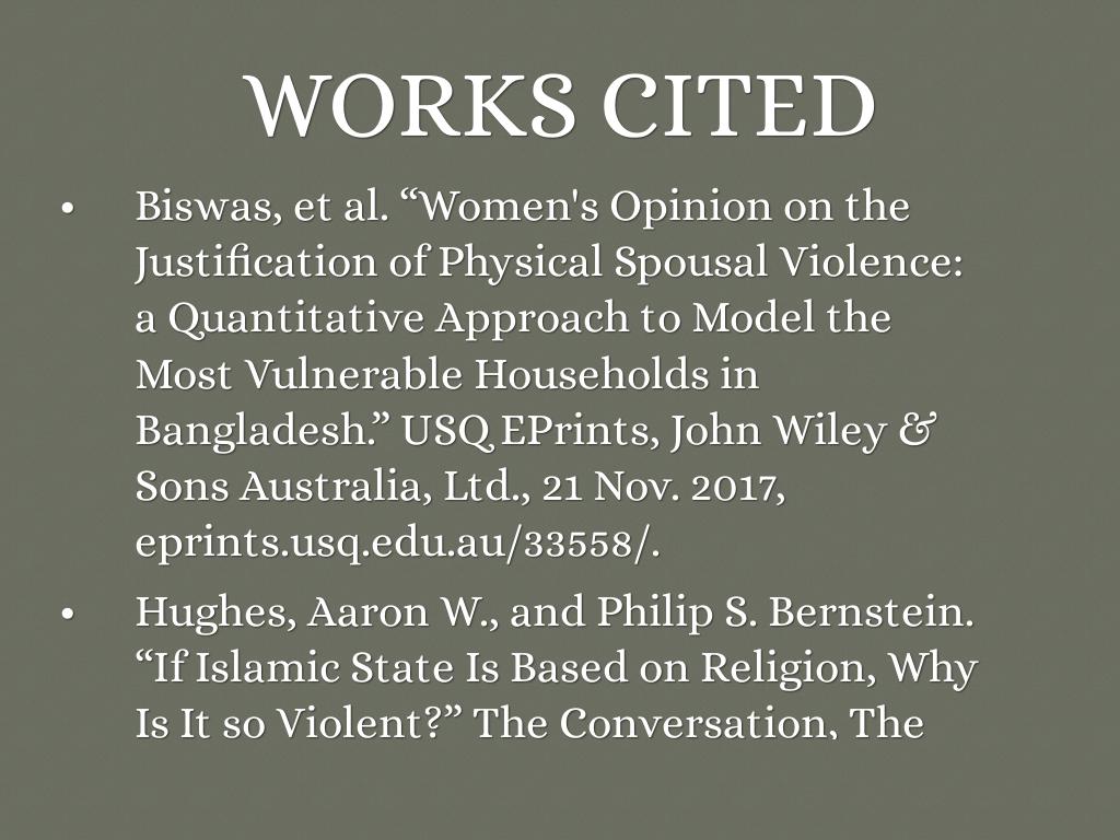 In a study from the country Bangladesh, it is shown that most women accept physical violence as a general norm because that is what their religion tells them to believe. Although other factors such as wealth index, education, and geographical division took a role, religion was the most significant factor contributing to the belief.