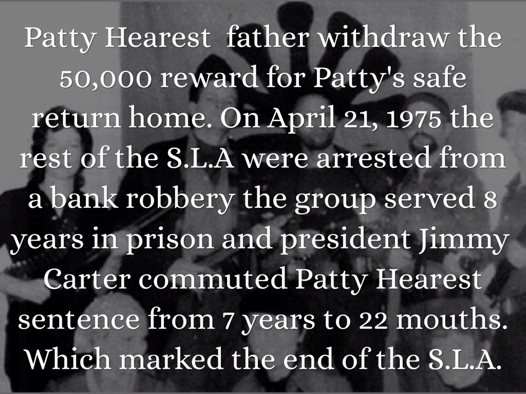 Patty Hearest father withdraw the 50,000 reward for Patty's safe return home. On April 21, 1975 the rest of the S.L.A were arrested from a bank robbery the group served 8 years in prison and president Jimmy Carter commuted Patty Hearest sentence from 7 years to 22 mouths. Which marked the end of the S.L.A.