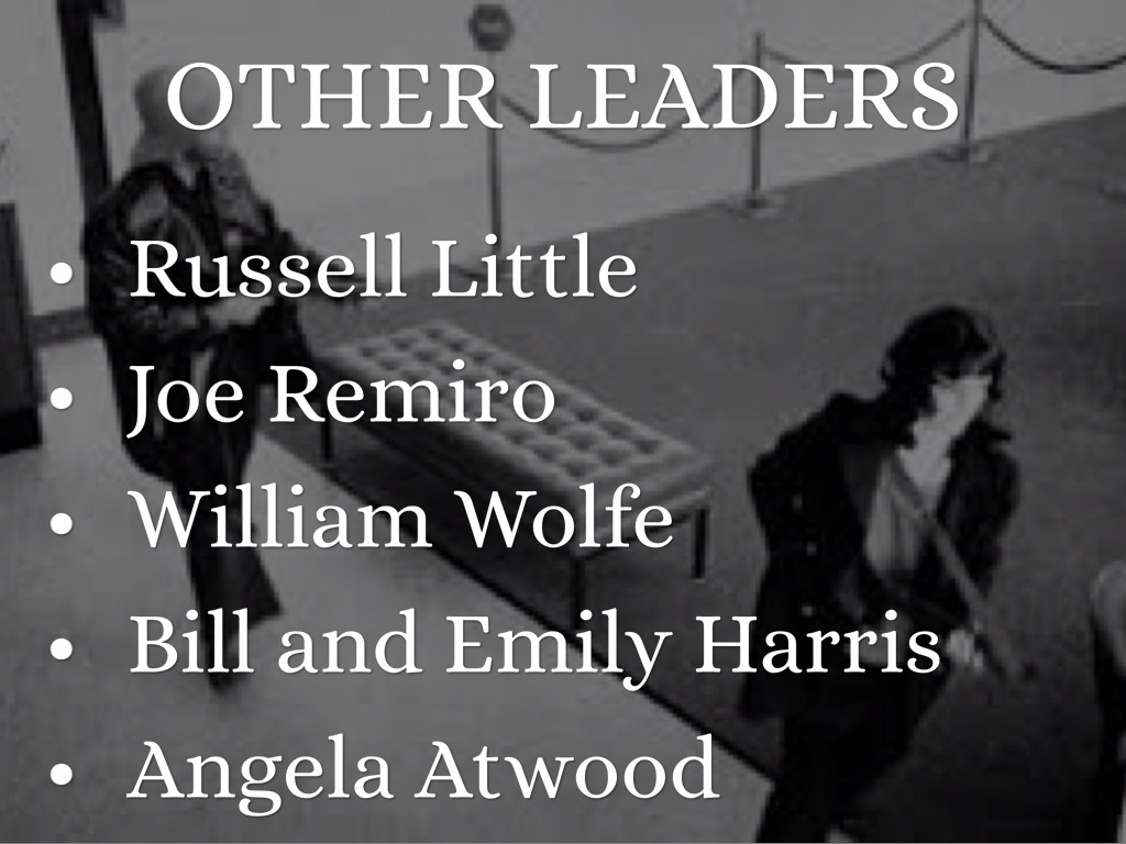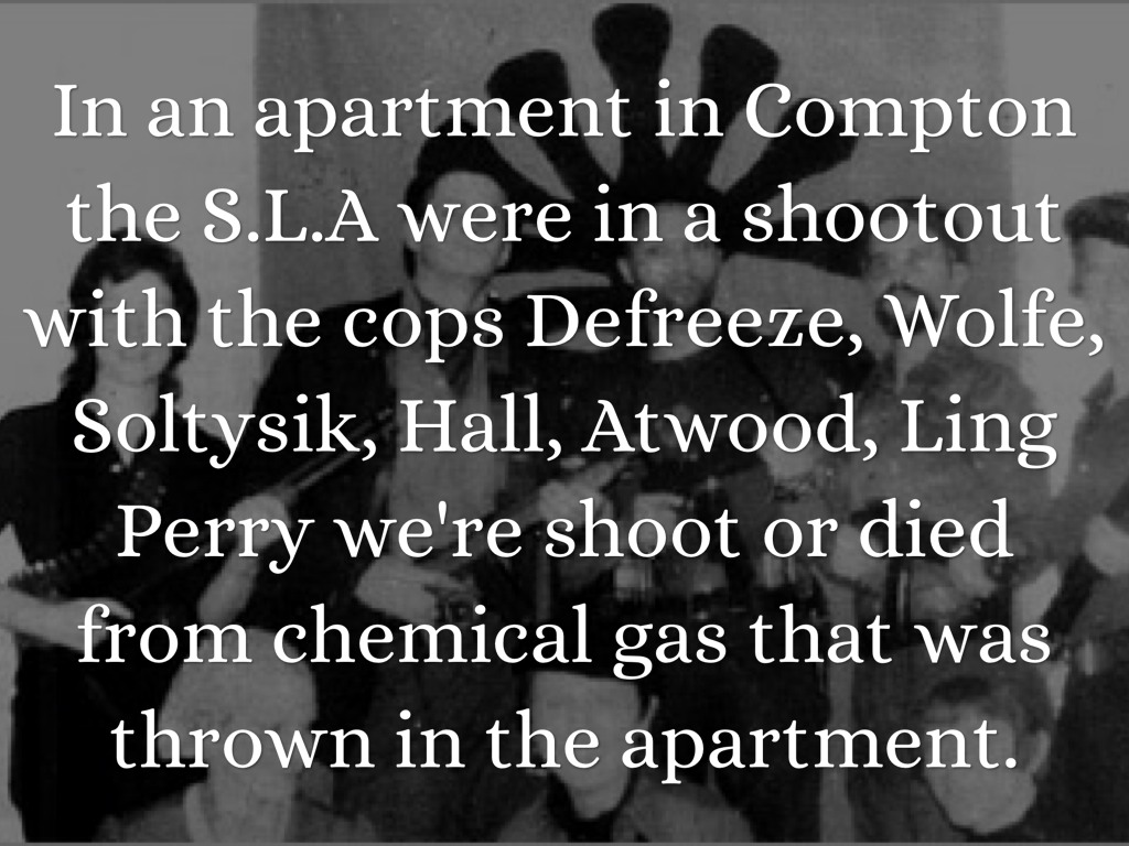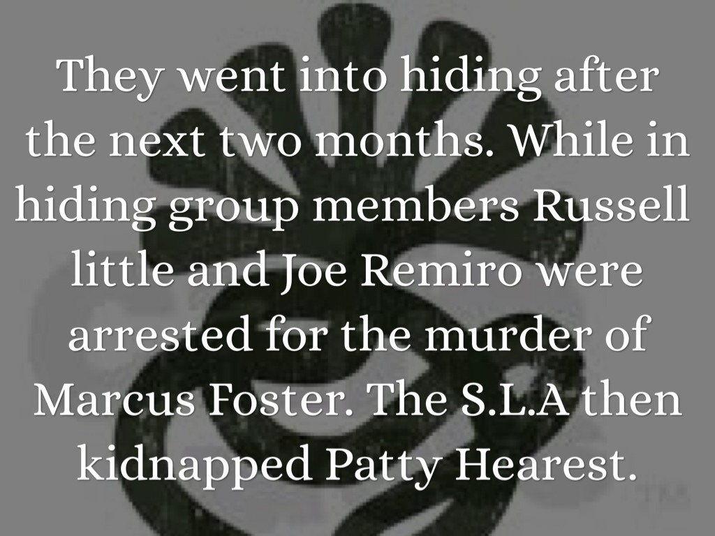 They went into hiding after the next two months. While in hiding group members Russell little and Joe Remiro were arrested for the murder of Marcus Foster. The S.L.A then kidnapped Patty Hearest.