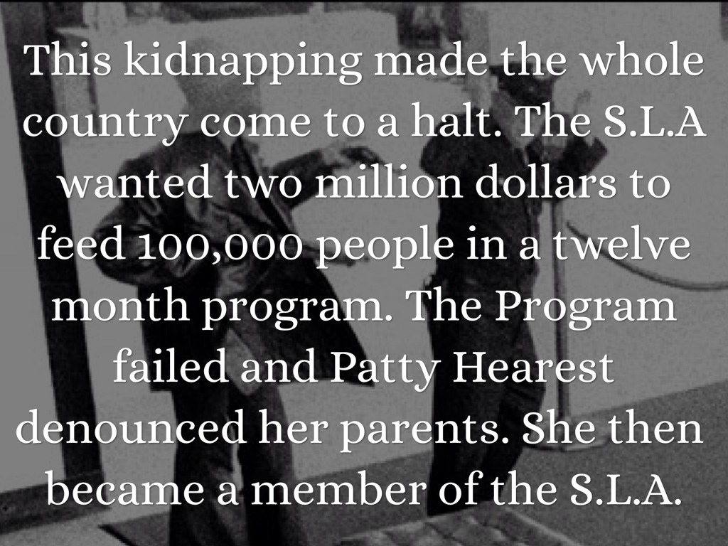 This kidnapping made the whole country come to a halt. The S.L.A wanted two million dollars to feed 100,000 people in a twelve month program. The Program failed and Patty Hearest denounced her parents. She then became a member of the S.L.A.