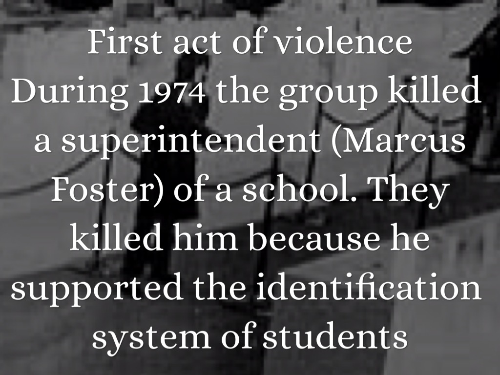 During 1974 the group killed a superintendent (Marcus Foster) of a school. They killed him because he supported the identification system of students