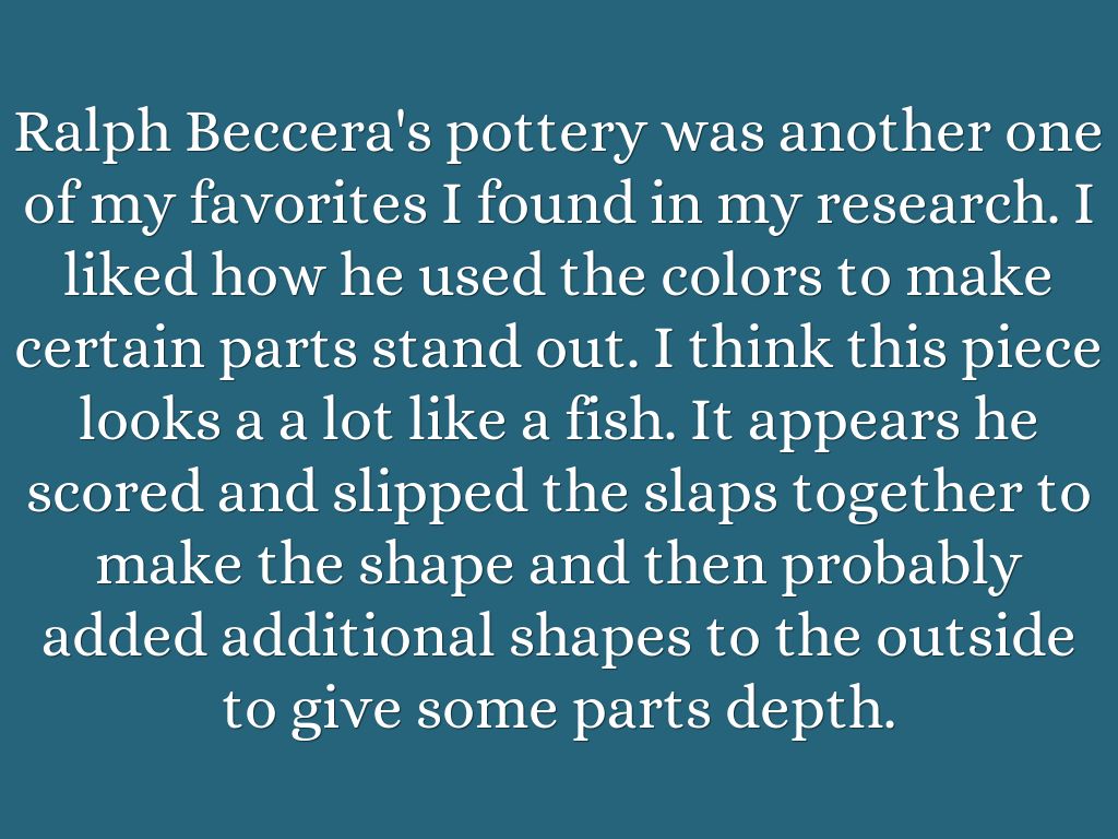 Ralph Beccera's pottery was another one of my favorites I found in my research. I liked how he used the colors to make certain parts stand out. I think this piece looks a a lot like a fish. It appears he scored and slipped the slaps together to make the shape and then probably added additional shapes to the outside to give some parts depth.