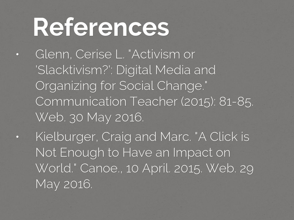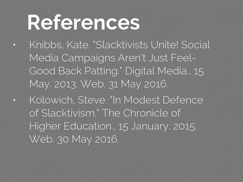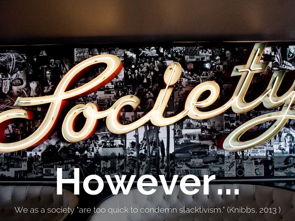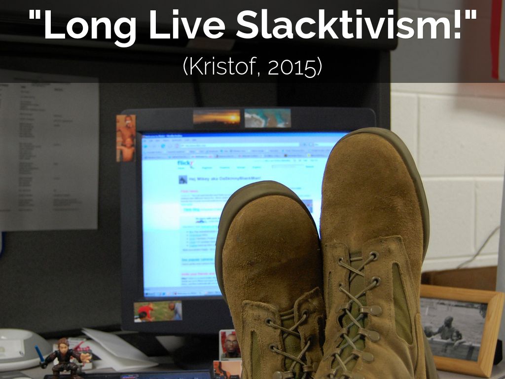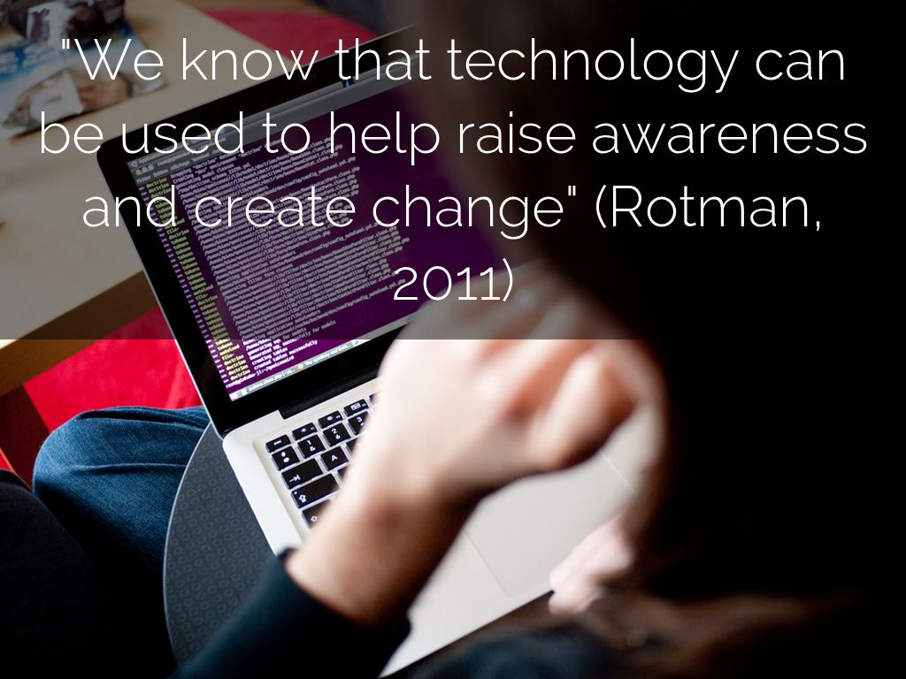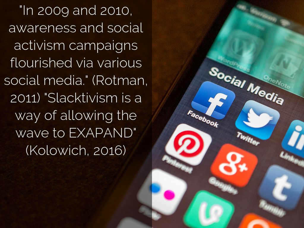 "In 2009 and 2010, awareness and social activism campaigns flourished via various social media." (Rotman, 2011) "Slacktivism is a way of allowing the wave to EXAPAND" (Kolowich, 2016)