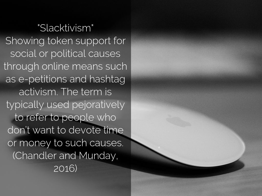 "Slacktivism" Showing token support for social or political causes through online means such as e-petitions and hashtag activism. The term is typically used pejoratively to refer to people who don’t want to devote time or money to such causes. (Chandler and Munday, 2016)