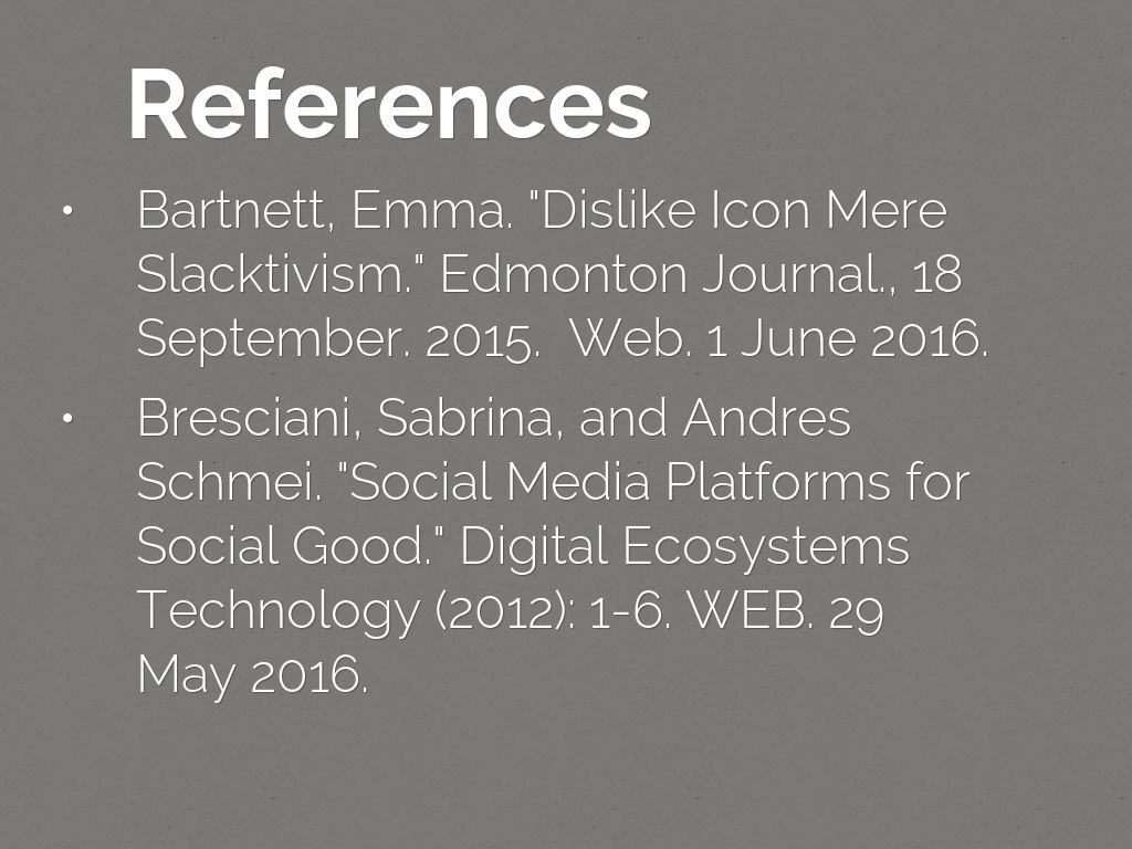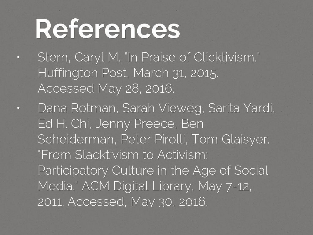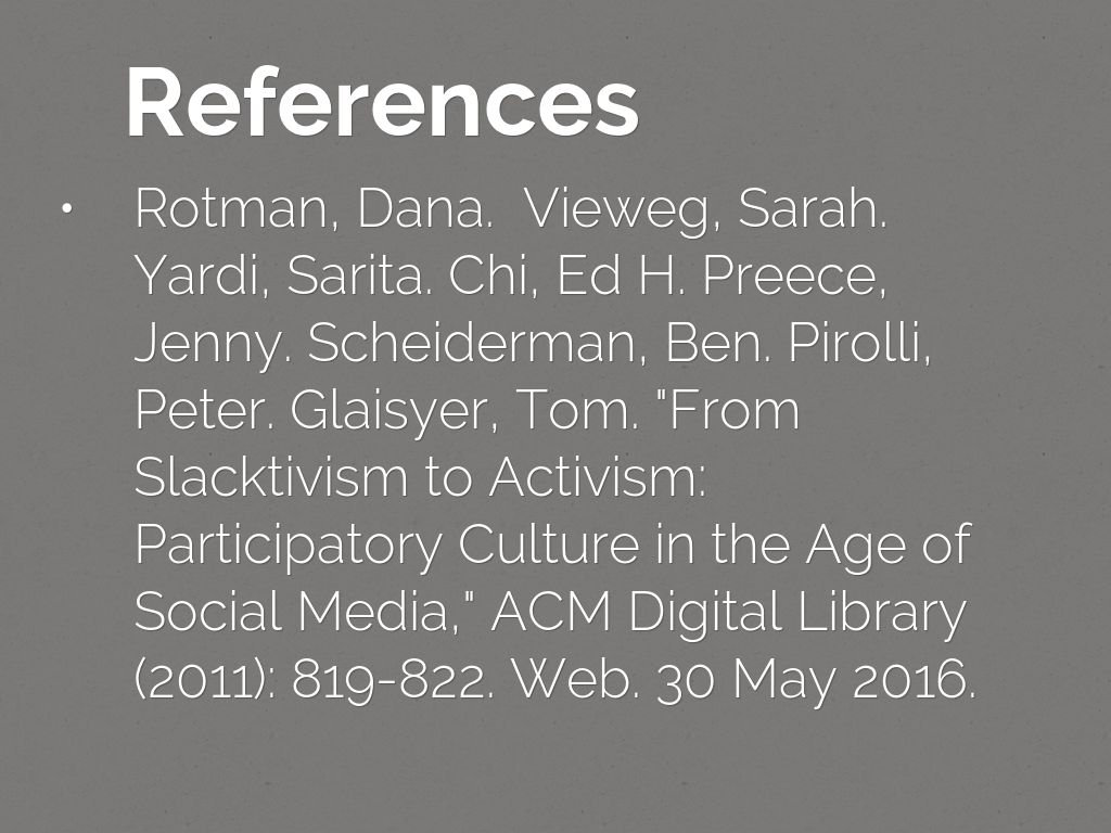 Rotman, Dana. Vieweg, Sarah. Yardi, Sarita. Chi, Ed H. Preece, Jenny. Scheiderman, Ben. Pirolli, Peter. Glaisyer, Tom. "From Slacktivism to Activism: Participatory Culture in the Age of Social Media," ACM Digital Library (2011): 819-822. Web. 30 May 2016.
