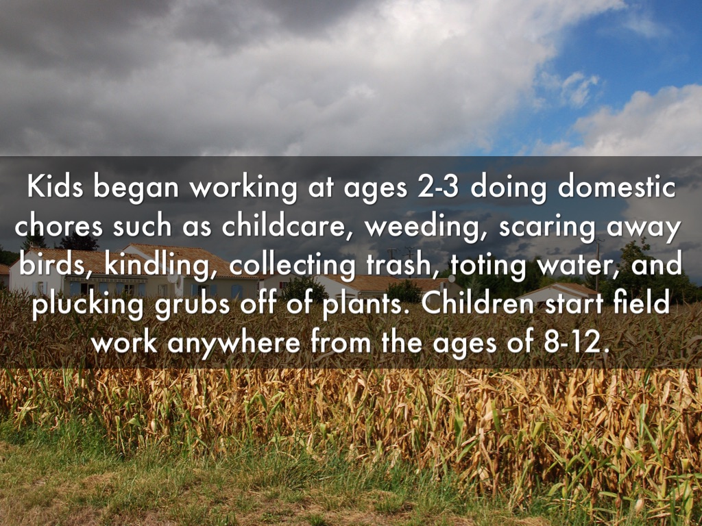 Kids began working at ages 2-3 doing domestic chores such as childcare, weeding, scaring away birds, kindling, collecting trash, toting water, and plucking grubs off of plants. Children start field work anywhere from the ages of 8-12.