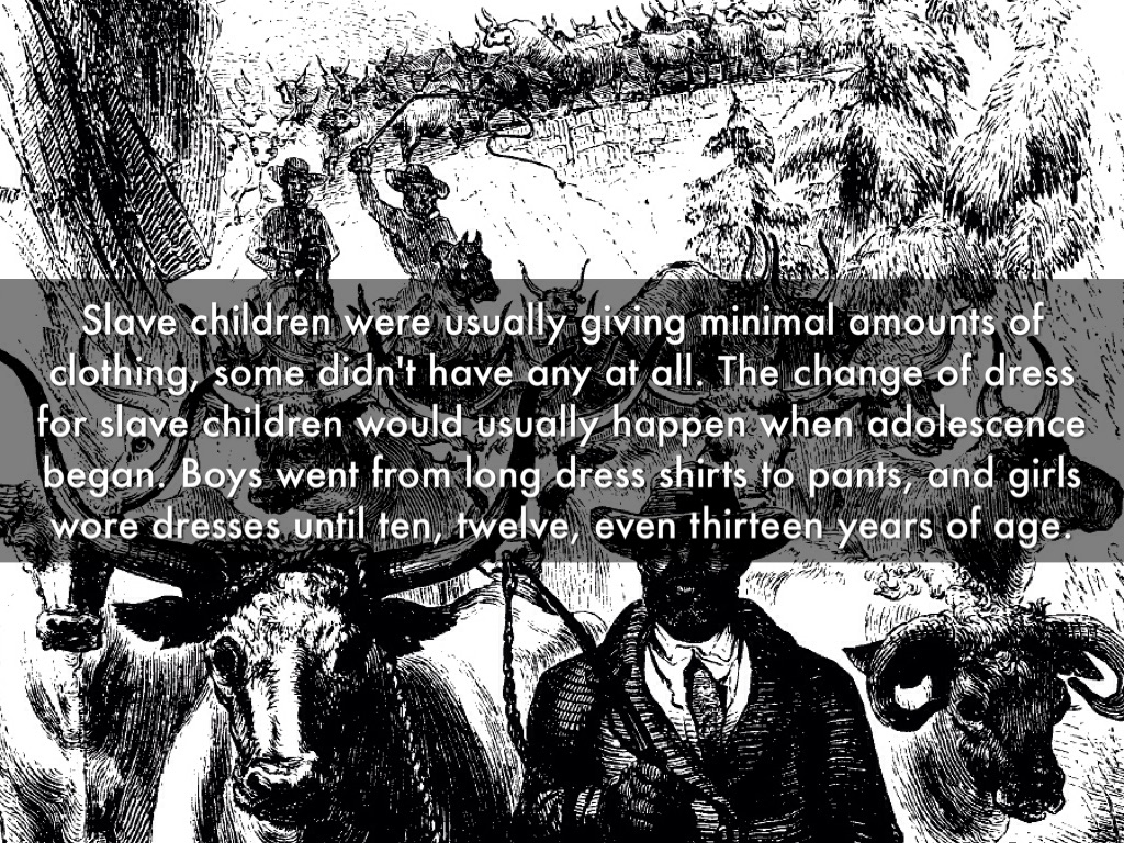 Slave children were usually giving minimal amounts of clothing, some didn't have any at all. The change of dress for slave children would usually happen when adolescence began. Boys went from long dress shirts to pants, and girls wore dresses until ten, twelve, even thirteen years of age.