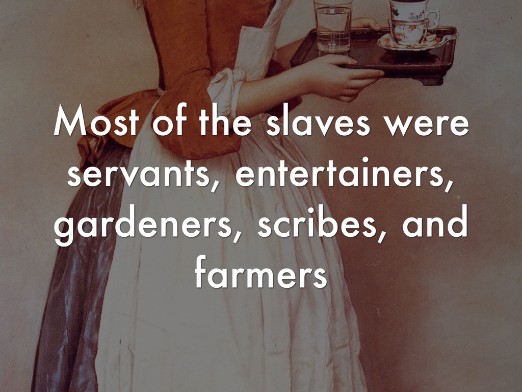 Most of the slaves were servants, entertainers, gardeners, scribes, and farmers