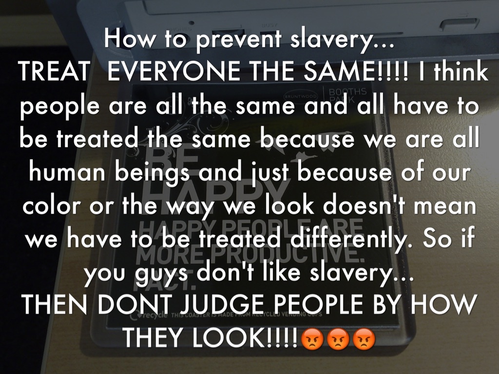 TREAT EVERYONE THE SAME!!!! I think people are all the same and all have to be treated the same because we are all human beings and just because of our color or the way we look doesn't mean we have to be treated differently. So if you guys don't like slavery...