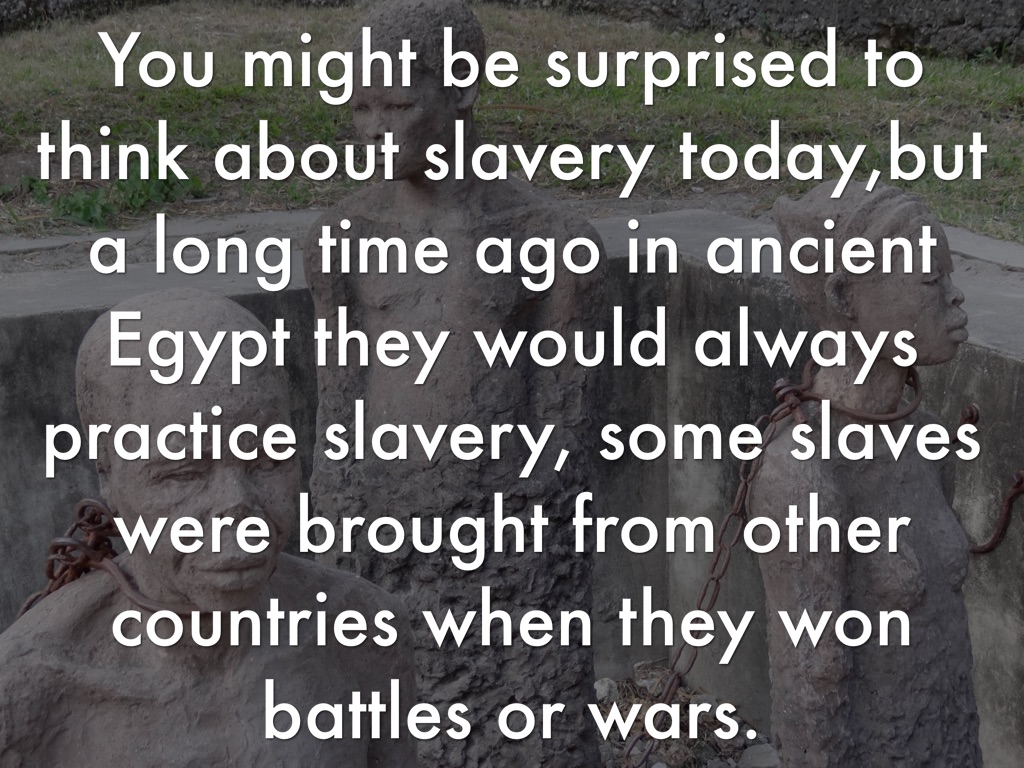 You might be surprised to think about slavery today,but a long time ago in ancient Egypt they would always practice slavery, some slaves were brought from other countries when they won battles or wars.