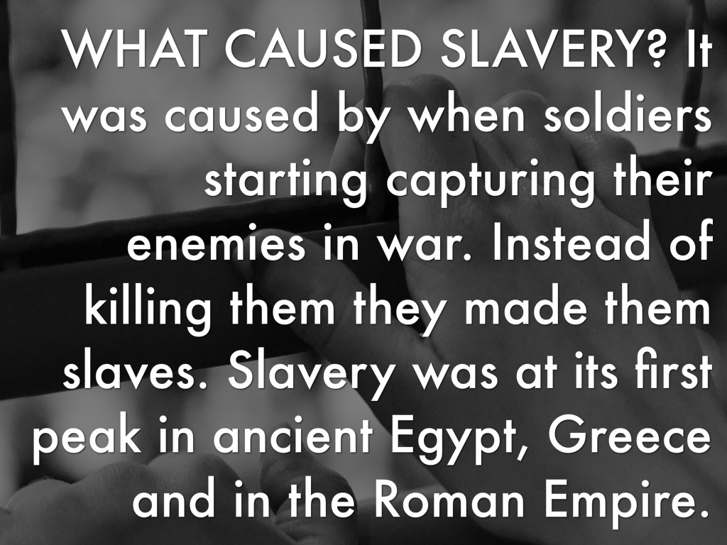 WHAT CAUSED SLAVERY? It was caused by when soldiers starting capturing their enemies in war. Instead of killing them they made them slaves. Slavery was at its first peak in ancient Egypt, Greece and in the Roman Empire.