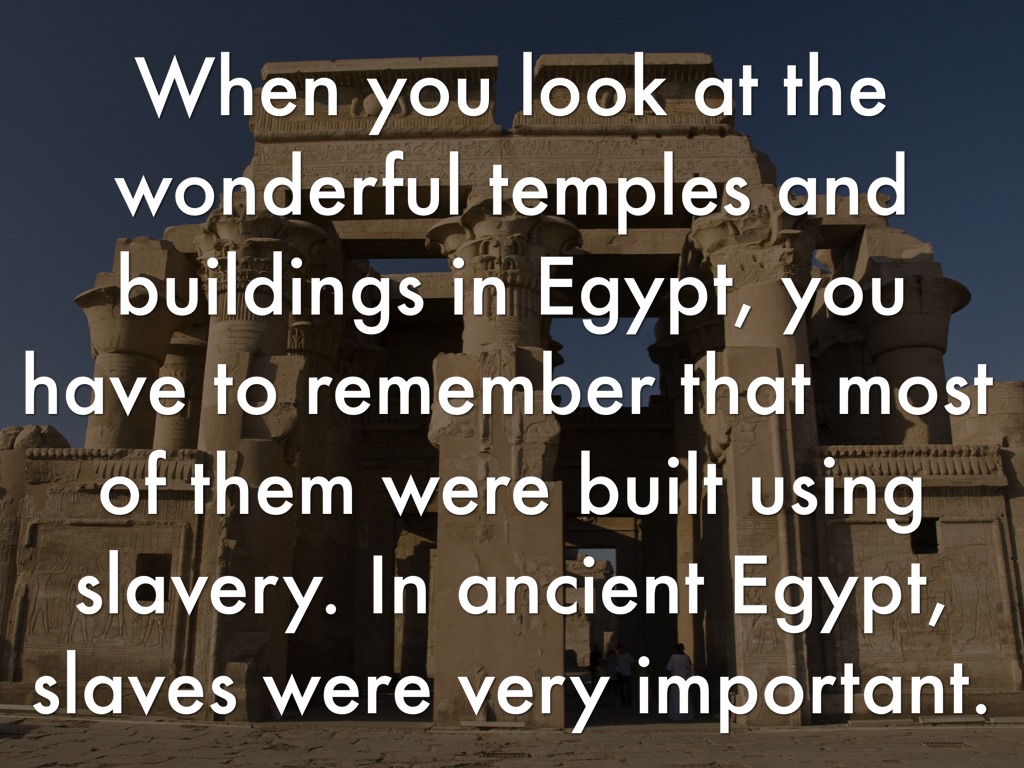 When you look at the wonderful temples and buildings in Egypt, you have to remember that most of them were built using slavery. In ancient Egypt, slaves were very important.