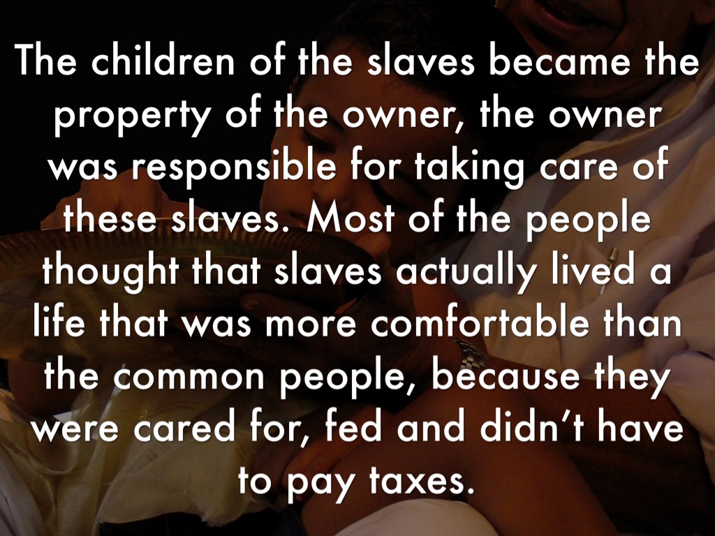 The children of the slaves became the property of the owner, the owner was responsible for taking care of these slaves. Most of the people thought that slaves actually lived a life that was more comfortable than the common people, because they were cared for, fed and didn’t have to pay taxes.