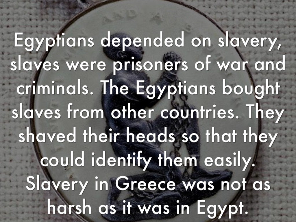 Egyptians depended on slavery, slaves were prisoners of war and criminals. The Egyptians bought slaves from other countries. They shaved their heads so that they could identify them easily. Slavery in Greece was not as harsh as it was in Egypt.