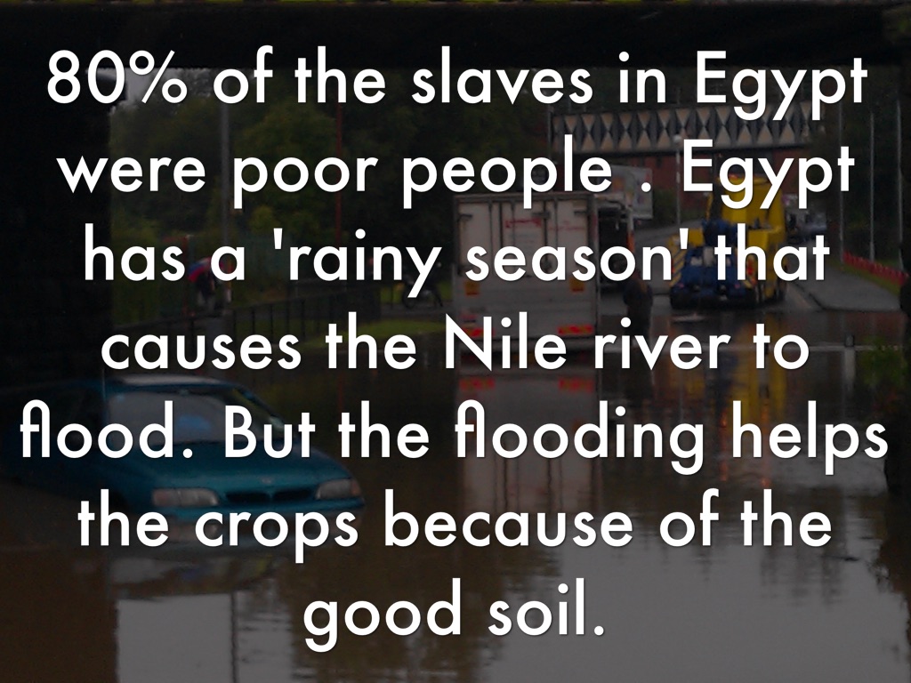 80% of the slaves in Egypt were poor people . Egypt has a 'rainy season' that causes the Nile river to flood. But the flooding helps the crops because of the good soil.