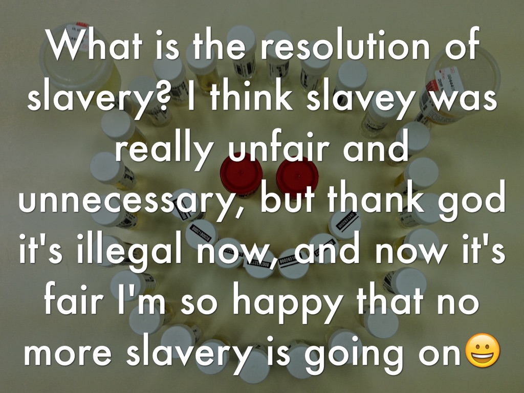 What is the resolution of slavery? I think slavey was really unfair and unnecessary, but thank god it's illegal now, and now it's fair I'm so happy that no more slavery is going on😀