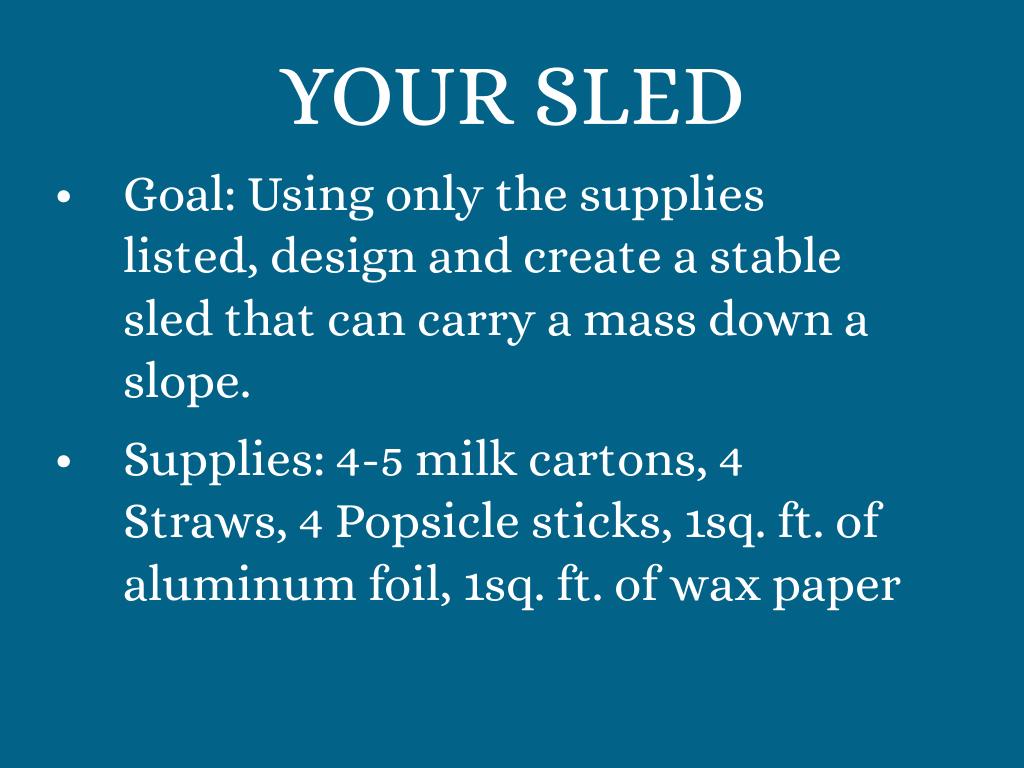 • Goal: Using only the supplies listed, design and create a stable sled that can carry a mass down a slope.