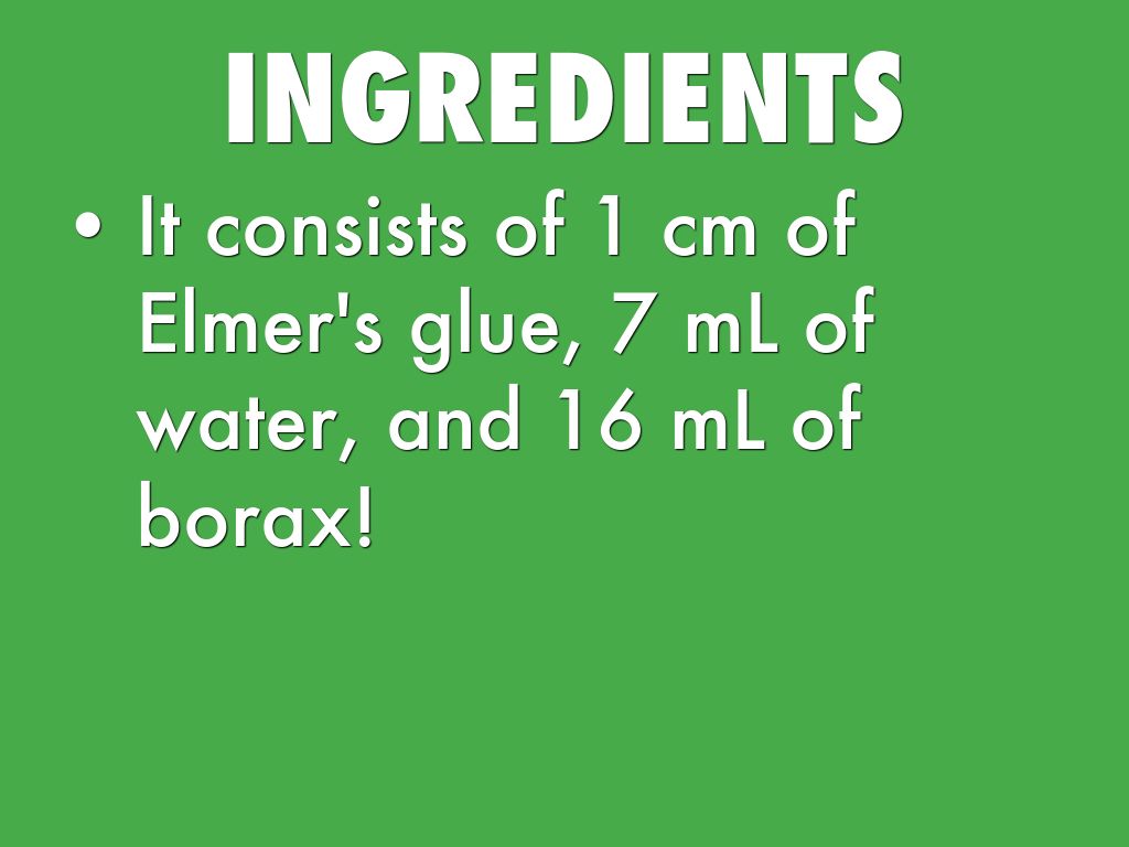 It consists of 1 cm of Elmer's glue, 7 mL of water, and 16 mL of borax!