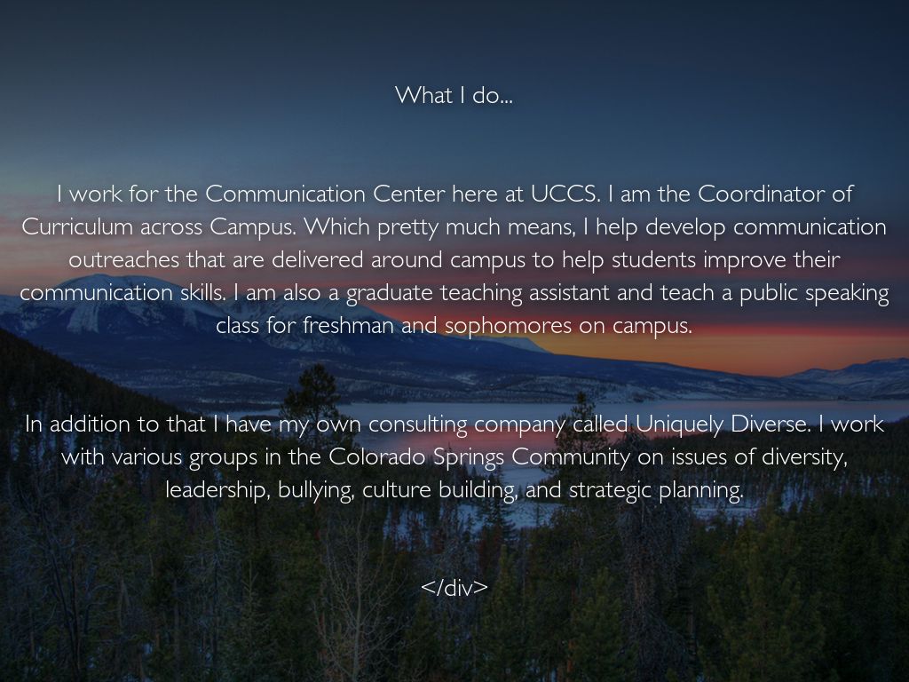 I work for the Communication Center here at UCCS. I am the Coordinator of Curriculum across Campus. Which pretty much means, I help develop communication outreaches that are delivered around campus to help students improve their communication skills. I am also a graduate teaching assistant and teach a public speaking class for freshman and sophomores on campus.