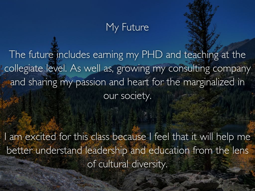 The future includes earning my PHD and teaching at the collegiate level. As well as, growing my consulting company and sharing my passion and heart for the marginalized in our society.