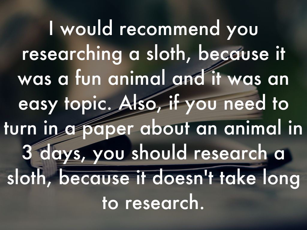 I would recommend you researching a sloth, because it was a fun animal and it was an easy topic. Also, if you need to turn in a paper about an animal in 3 days, you should research a sloth, because it doesn't take long to research.