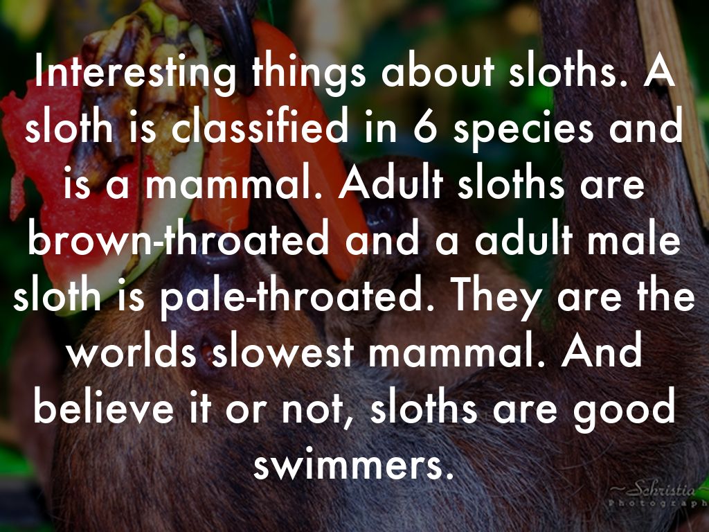 Interesting things about sloths. A sloth is classified in 6 species and is a mammal. Adult sloths are brown-throated and a adult male sloth is pale-throated. They are the worlds slowest mammal. And believe it or not, sloths are good swimmers.