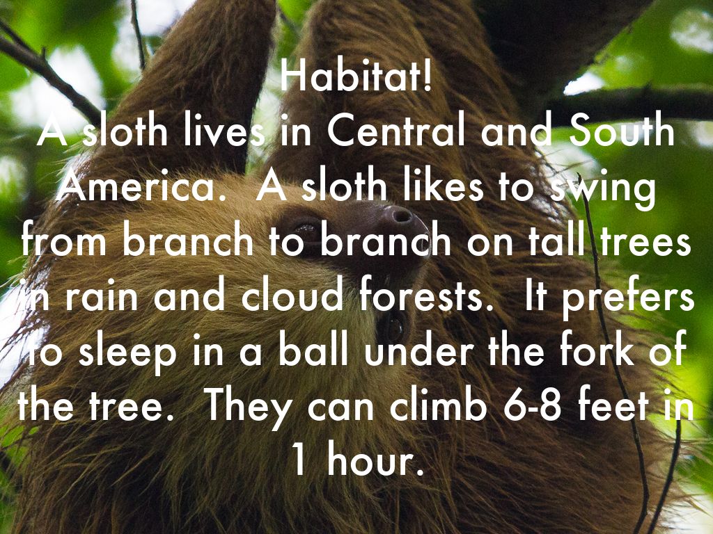 A sloth lives in Central and South America. A sloth likes to swing from branch to branch on tall trees in rain and cloud forests. It prefers to sleep in a ball under the fork of the tree. They can climb 6-8 feet in 1 hour.