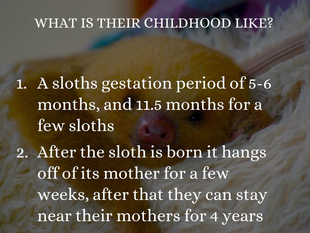 After the sloth is born it hangs off of its mother for a few weeks, after that they can stay near their mothers for 4 years