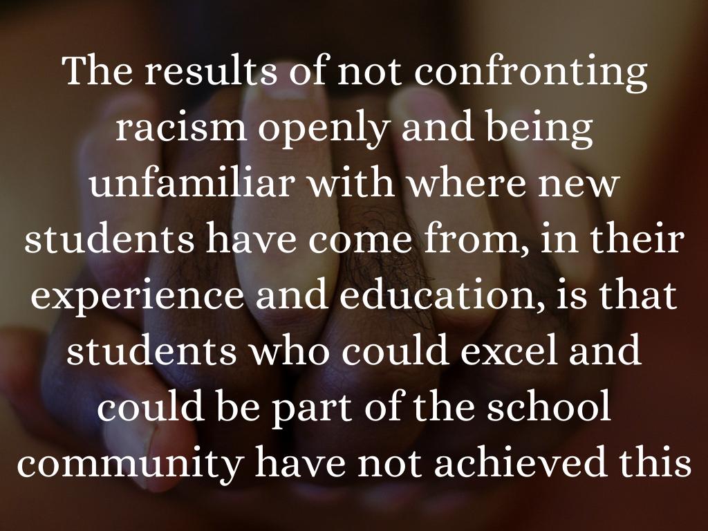 The results of not confronting racism openly and being unfamiliar with where new students have come from, in their experience and education, is that students who could excel and could be part of the school community have not achieved this