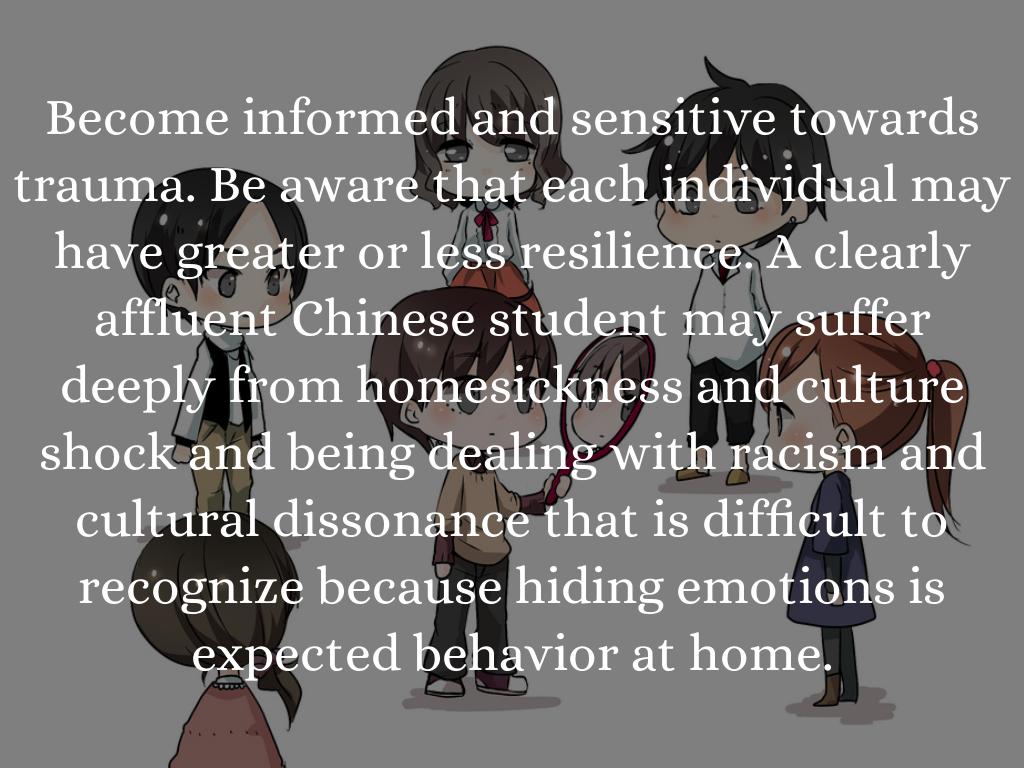 Become informed and sensitive towards trauma. Be aware that each individual may have greater or less resilience. A clearly affluent Chinese student may suffer deeply from homesickness and culture shock and being dealing with racism and cultural dissonance that is difficult to recognize because hiding emotions is expected behavior at home.
