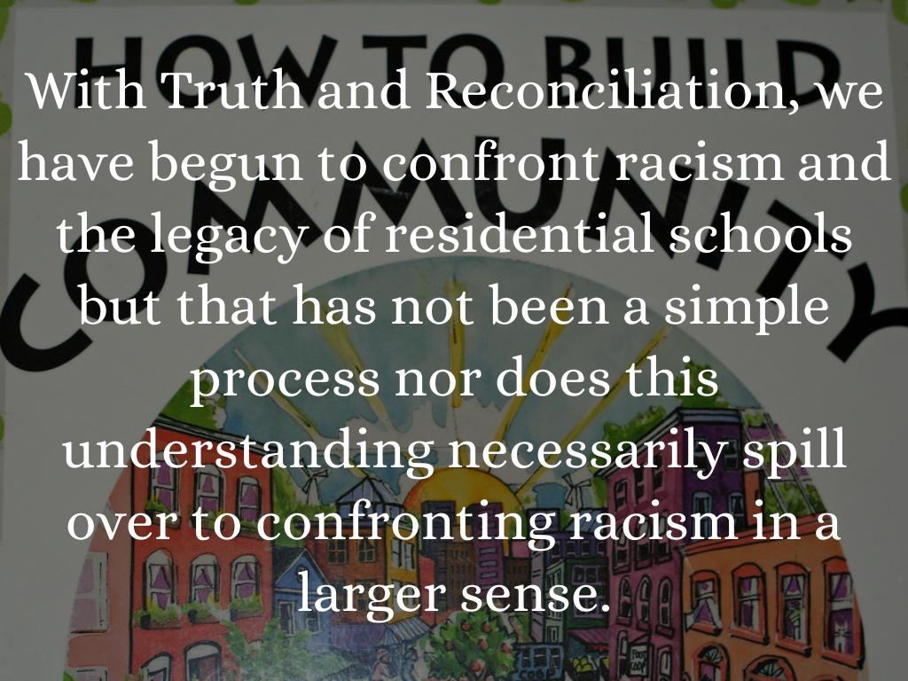 With Truth and Reconciliation, we have begun to confront racism and the legacy of residential schools but that has not been a simple process nor does this understanding necessarily spill over to confronting racism in a larger sense.