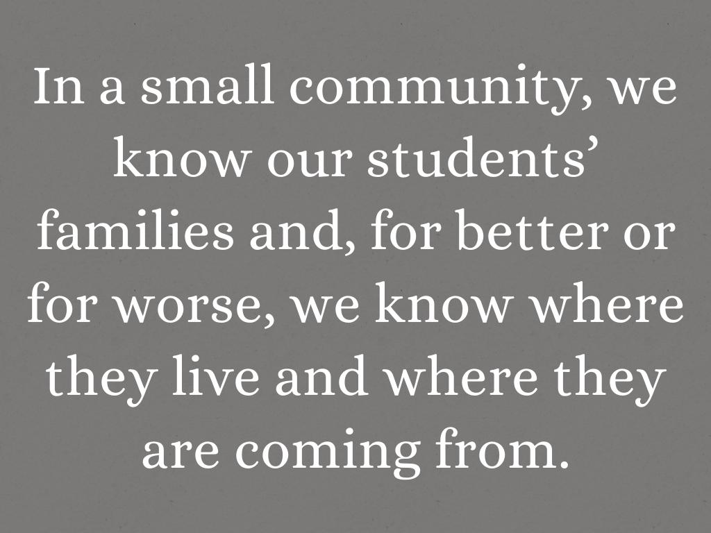 In a small community, we know our students’ families and, for better or for worse, we know where they live and where they are coming from.