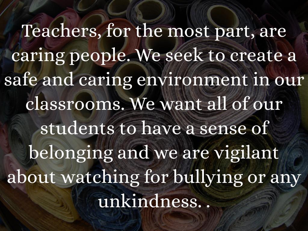 Teachers, for the most part, are caring people. We seek to create a safe and caring environment in our classrooms. We want all of our students to have a sense of belonging and we are vigilant about watching for bullying or any unkindness. .