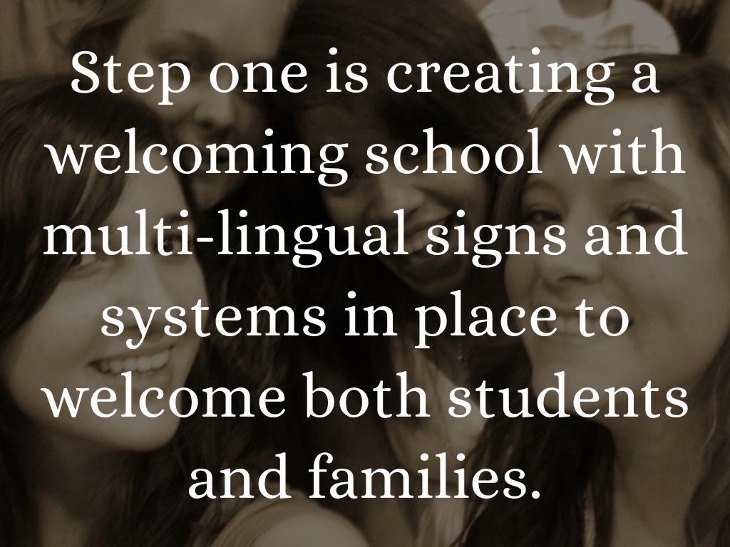 Step one is creating a welcoming school with multi-lingual signs and systems in place to welcome both students and families.