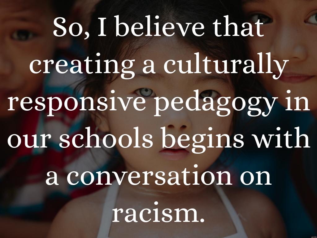 So, I believe that creating a culturally responsive pedagogy in our schools begins with a conversation on racism.