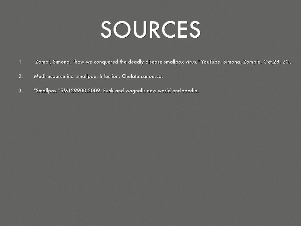 Zompi, Simona, "how we conquered the deadly disease smallpox virus." YouTube. Simona, Zompie. Oct,28, 2013. YouTube.con.