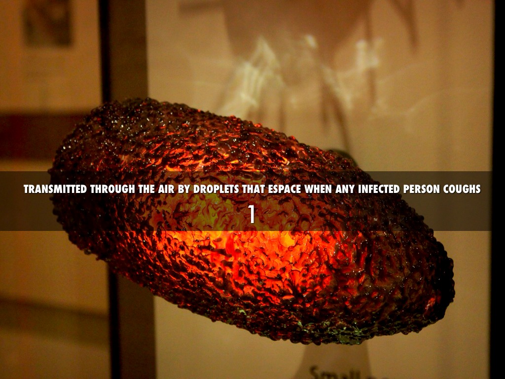 TRANSMITTED THROUGH THE AIR BY DROPLETS THAT ESPACE WHEN ANY INFECTED PERSON COUGHS
