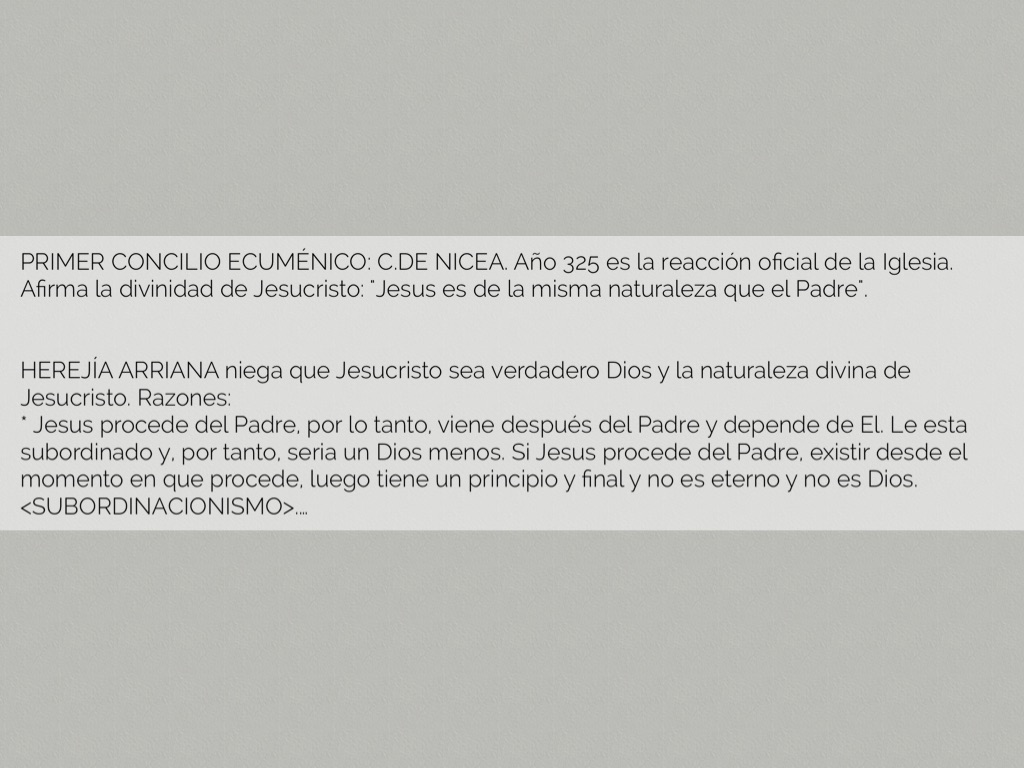 PRIMER CONCILIO ECUMÉNICO: C.DE NICEA. Año 325 es la reacción oficial de la Iglesia. Afirma la divinidad de Jesucristo: "Jesus es de la misma naturaleza que el Padre".