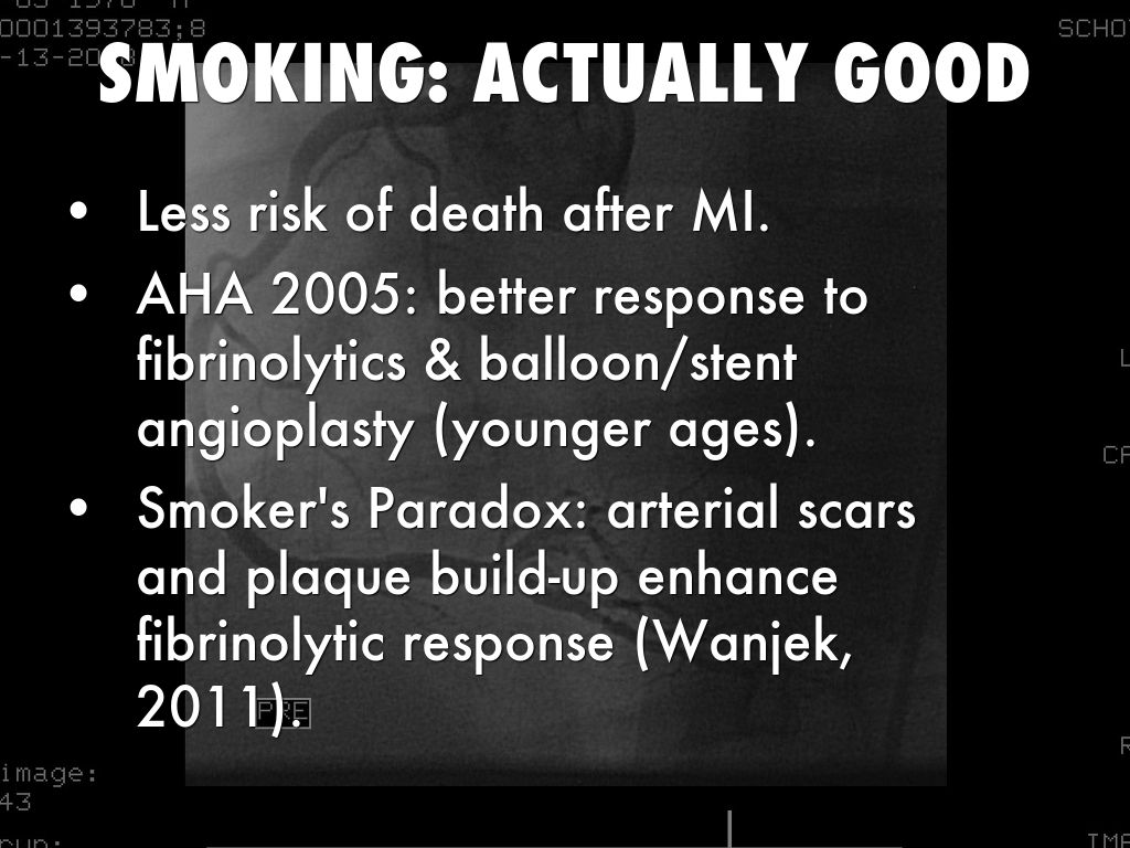 Smoker's Paradox: arterial scars and plaque build-up enhance fibrinolytic response (Wanjek, 2011).