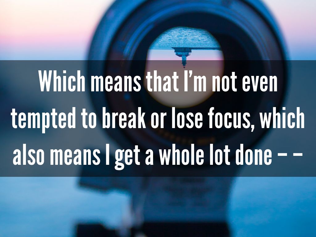 Which means that I’m not even tempted to break or lose focus, which also means I get a whole lot done – –