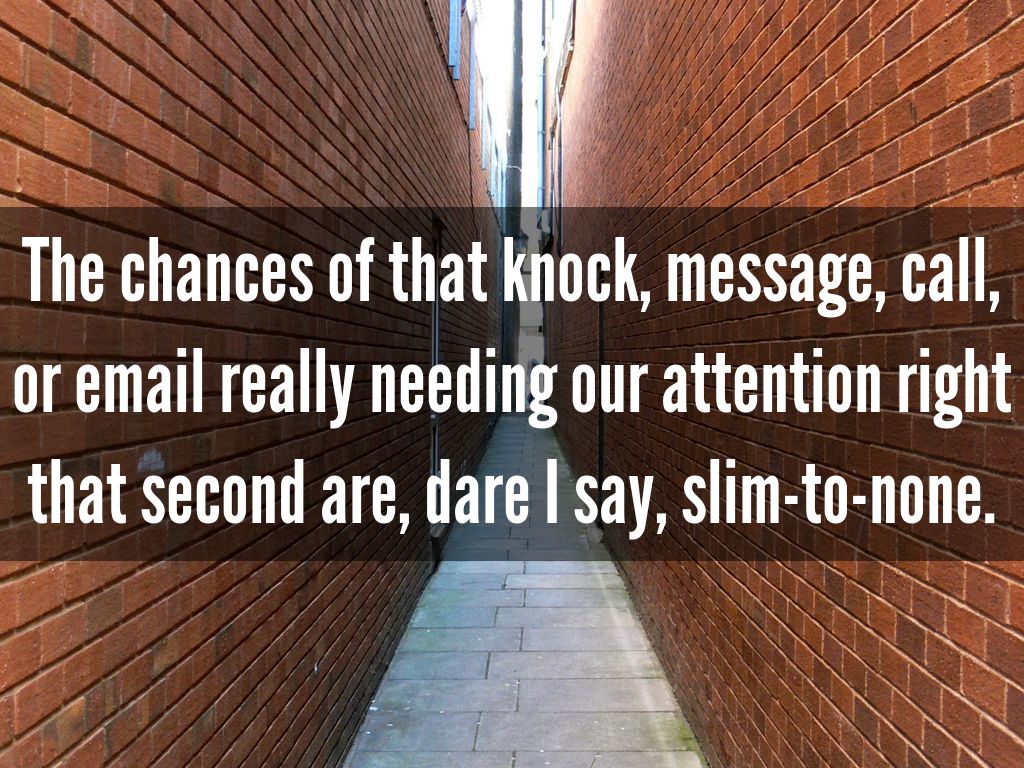 The chances of that knock, message, call, or email really needing our attention right that second are, dare I say, slim-to-none.