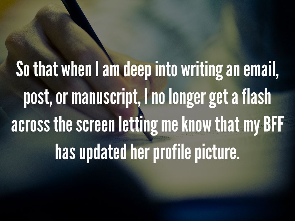 So that when I am deep into writing an email, post, or manuscript, I no longer get a flash across the screen letting me know that my BFF has updated her profile picture.