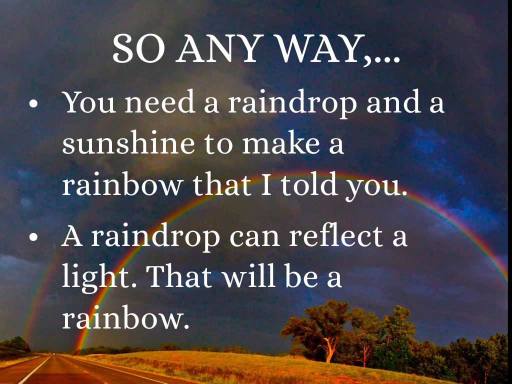 Do you know what is a prism? A prisms is a triangle that can reflect the light.It is same as raindrop!So prism can make a rainbow.DVD can also reflect a light.Not only raindrop can make a rainbow.